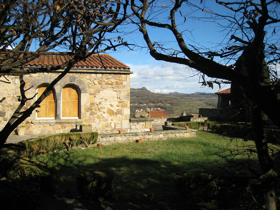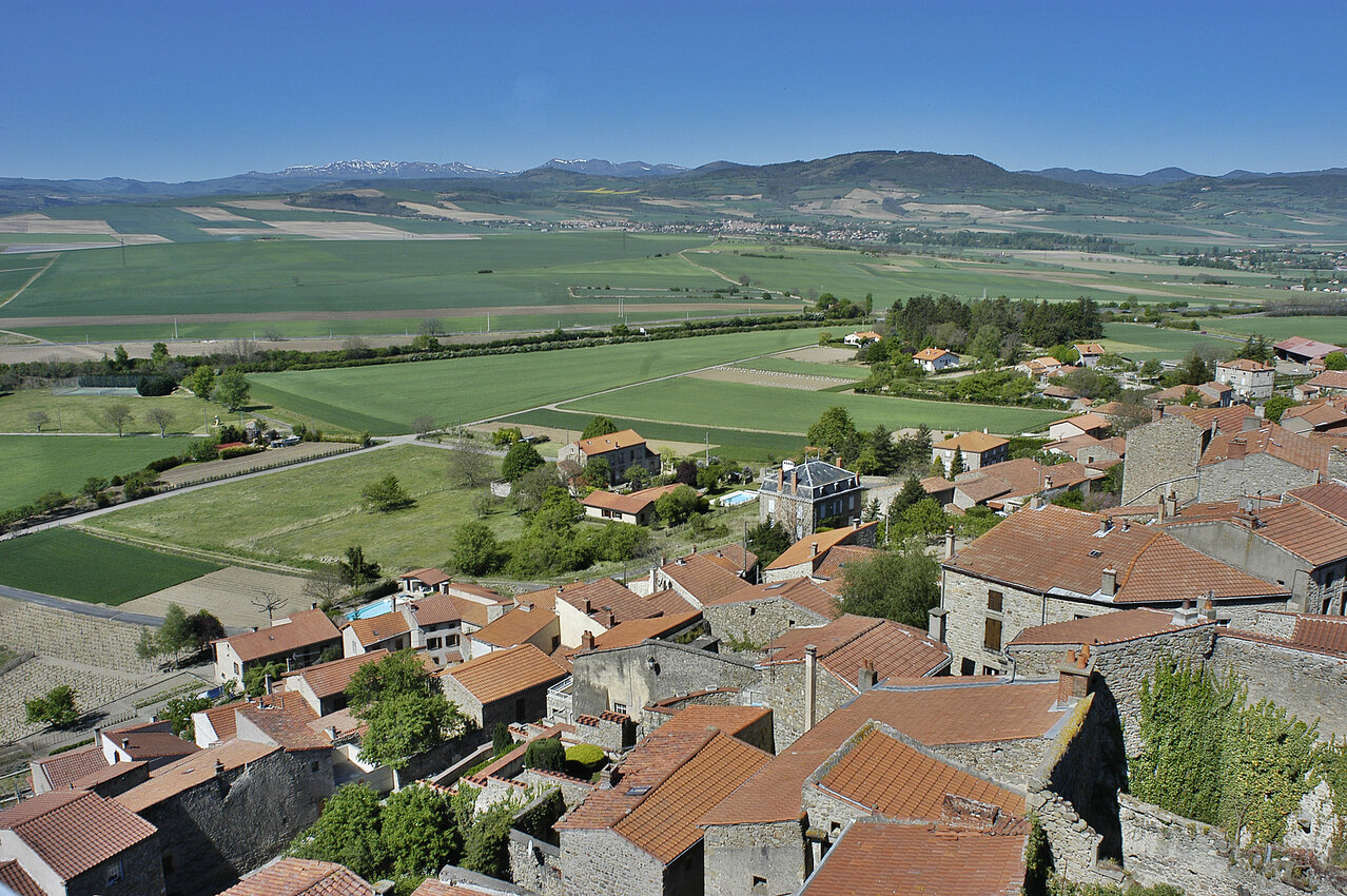 Le plan de Montpeyroux, très structuré, a été modelé autour et en fonction du château, qui occupe le sommet du relief et dont le gros donjon circulaire (un des plus beaux de l’Auvergne) et ses dépendances s'élèvent dans une basse-cour elliptique (le tracé en est marqué dans le parcellaire par une auréole de maisons et de rues). L'ensemble du village est enfermé dans une vaste enceinte flanquée de tours, à laquelle pourrait renvoyer la mention de la fin du XIVe siècle. L'église, mentionnée depuis le XVIIe siècle et longtemps succursale de celle de Coudes, a été reconstruite au milieu du XIXe siècle. Gabriel Fournier,